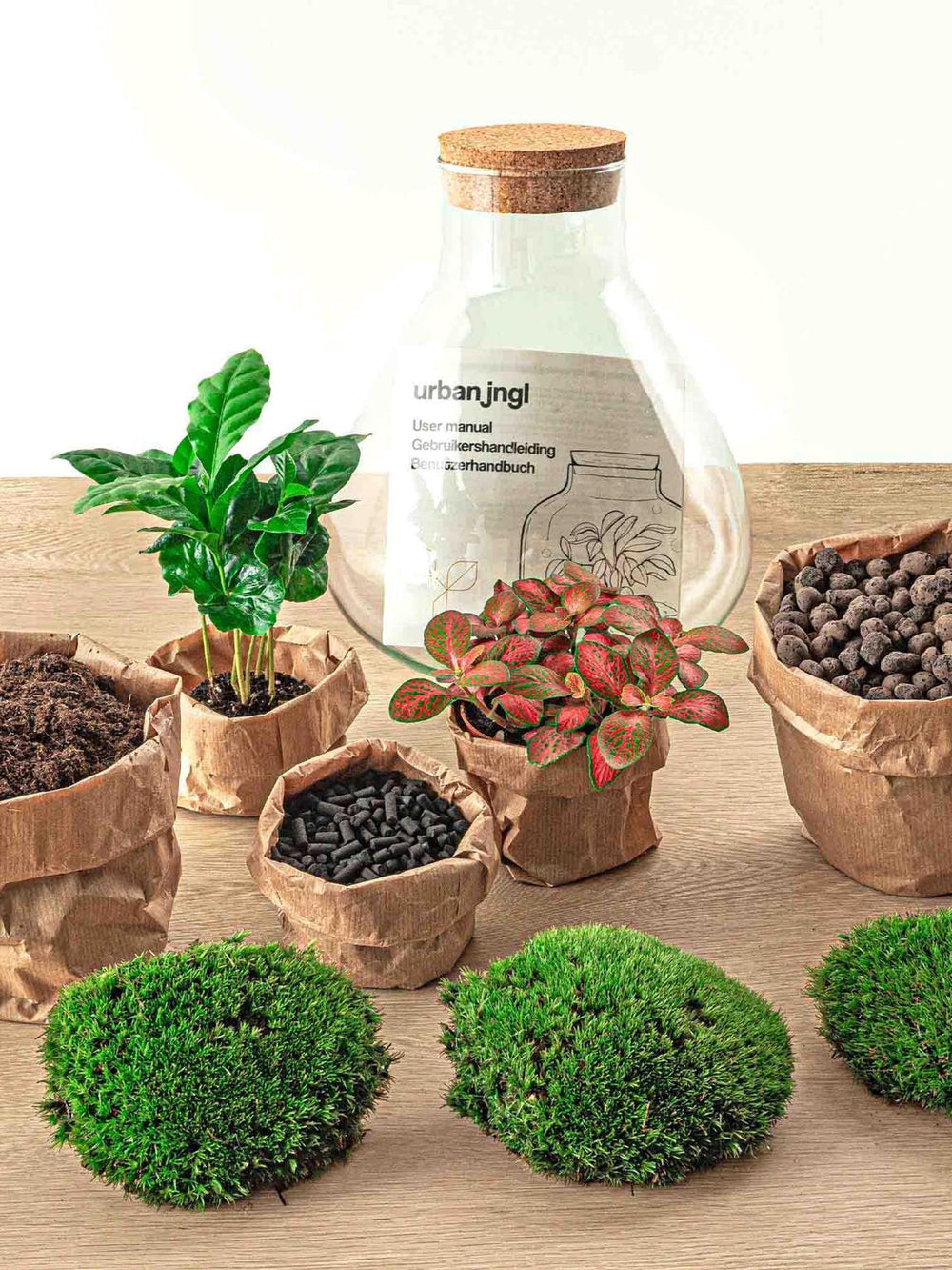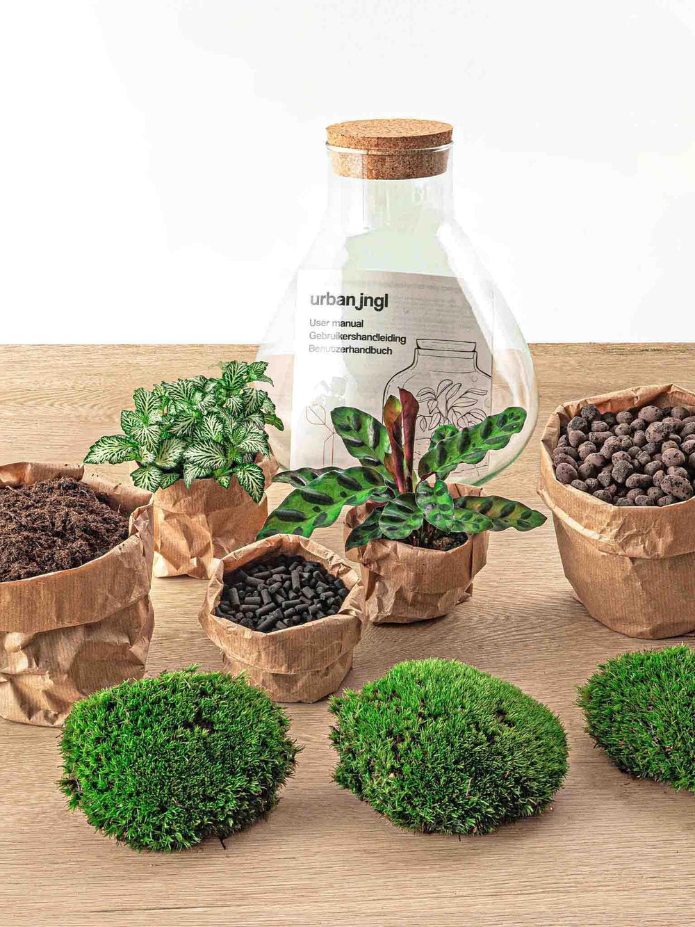 Hvert sæt er sammensat af alt, hvad der er nødvendigt for at lave et terrarium: en kvasi-autonom og selvforsynende miniaturehave. Ideel, når du ikke har en grøn tommelfinger!